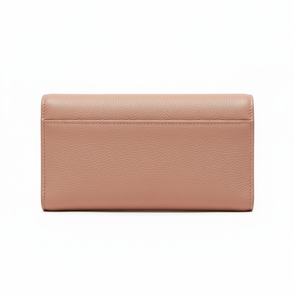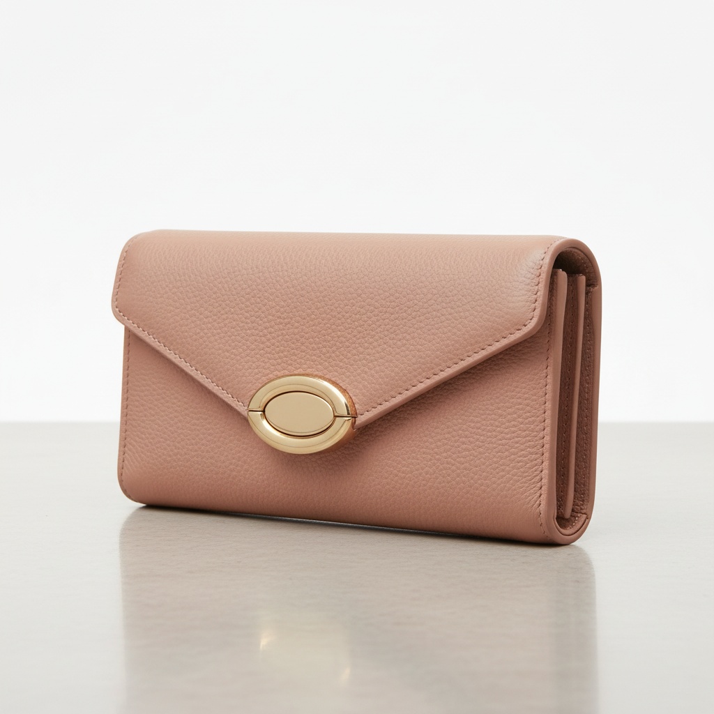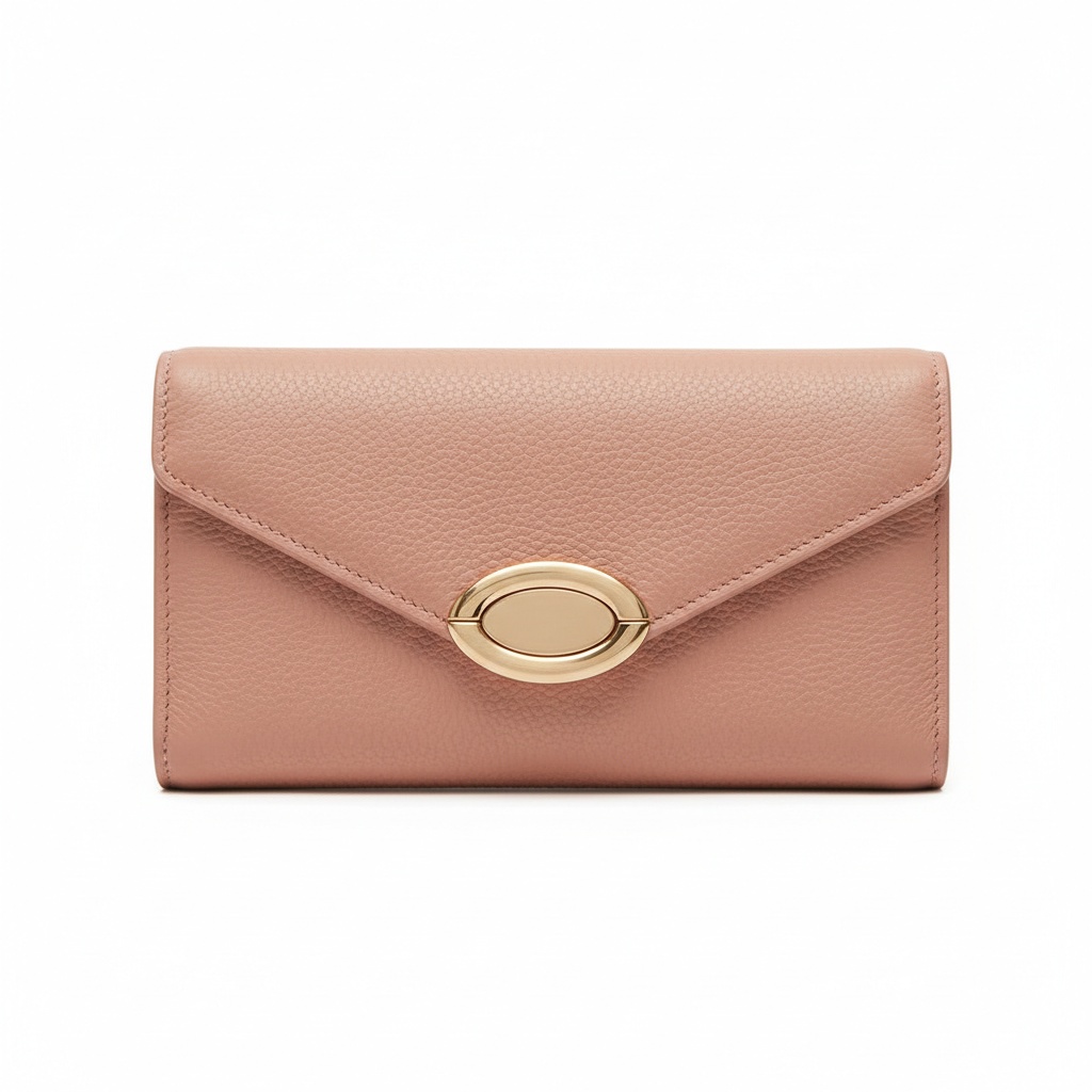 Soft, feminine, and functional. This elegant wallet features a pebbled leather finish in a beautiful blush rose tone, secured by a unique oval gold-tone clasp on a classic envelope flap.